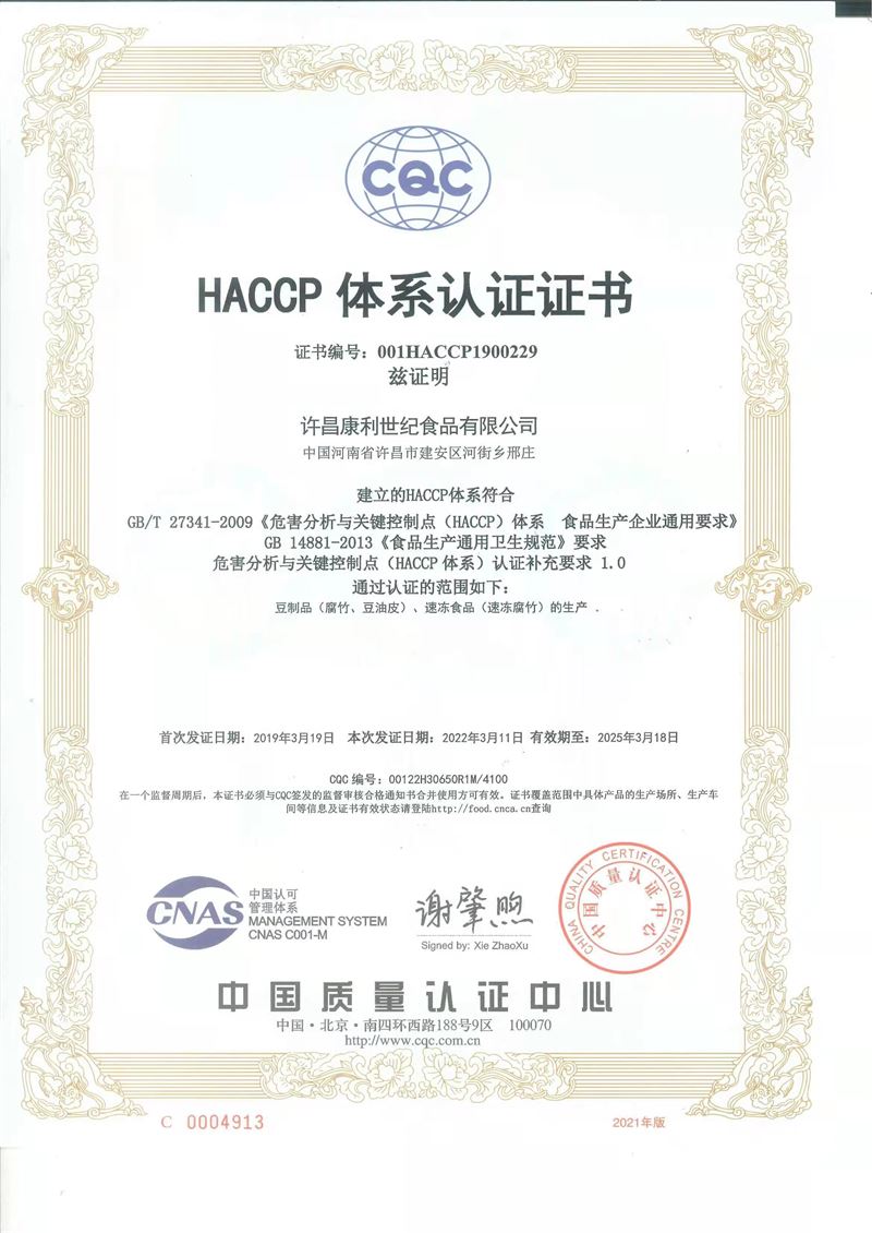 HACCP體系認(rèn)證證書